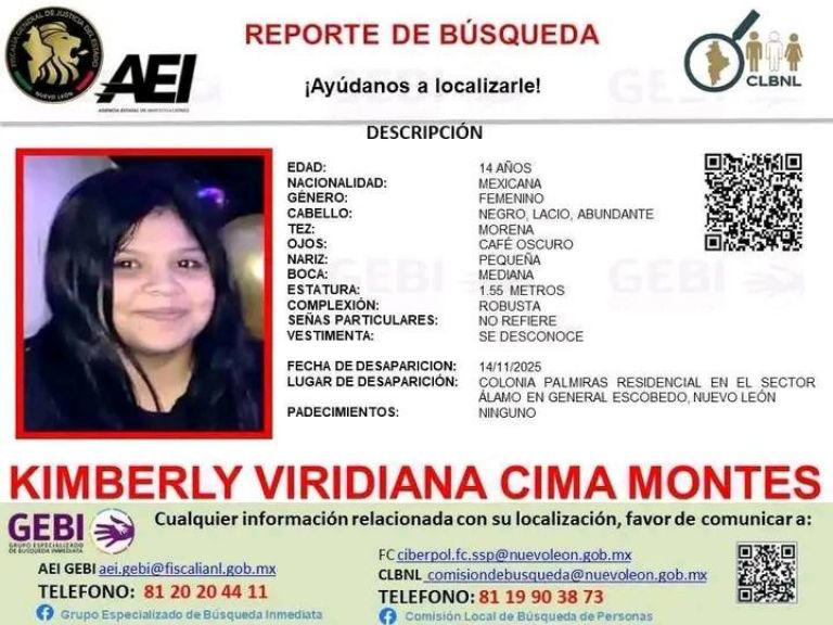 Escobedo, Nuevo León.- Kimberly Viridiana Cima Montes, de 14 años, fue vista por última vez el pasado 14 de noviembre en la colonia Palmiras Residencial, en el sector Álamo de Escobedo, y desde entonces no se tiene noticia de su paradero. La familia de la joven ha difundido su caso en redes sociales, solicitando apoyo ciudadano para localizarla lo antes posible.