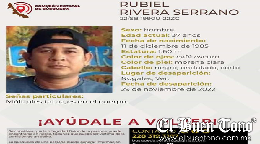 Nogales.- Amigos y familiares buscan con desesperación a Rubiel Rivera Serrano, de 37 años de edad, quien fue visto por última vez en el municipio de Nogales, el pasado 29 de noviembre del presente año.