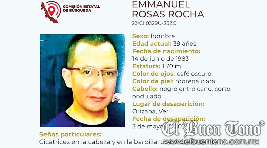 Al nombre de Emmanuel Rosas Rocha responde el ausente, de 39 años de edad, quien fue visto por última vez en la ciudad de Orizaba en la fecha antes citada.