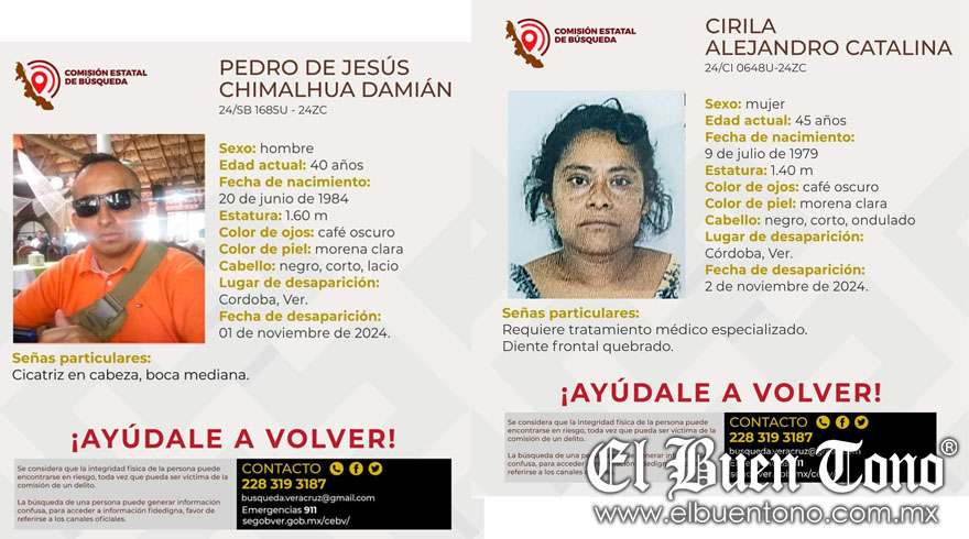 Córdoba.- La Comisión Estatal de Búsqueda emitió dos boletines de emergencia, por la desaparición de un hombre y una mujer en Córdoba.