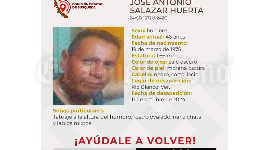 Se trata de José Antonio Salazar Huerta, de 46 años de edad, quien fue visto por última vez en el municipio de Río Blanco durante el transcurso de ayer viernes.