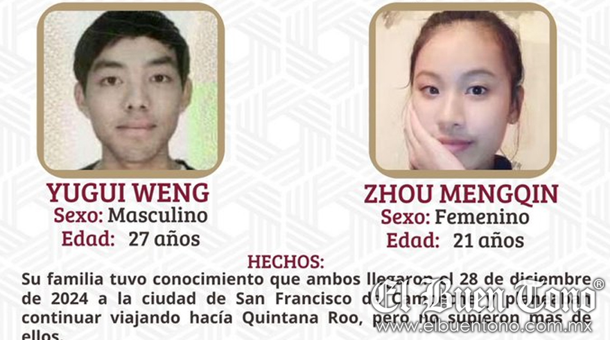 San Francisco, Campeche.- Las autoridades de la Fiscalía General del Estado (FGE) de Campeche han emitido un comunicado solicitando la colaboración ciudadana para localizar a dos turistas chinos, Yugui Weng, de 27 años, y Zhou Mengqin, de 21, quienes desaparecieron el 28 de diciembre en la ciudad de San Francisco, cuando se encontraban de paso en su recorrido turístico hacia el estado de Quintana Roo.