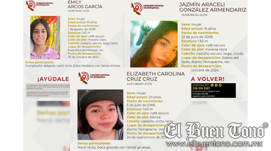 Veracruz.- En los municipios de Poza Rica y Álamo, Veracruz, tres mujeres, incluidas dos menores de edad, han sido reportadas como desaparecidas. La Comisión Estatal de Búsqueda de Personas ha activado las fichas correspondientes para solicitar la colaboración de la población en su localización.