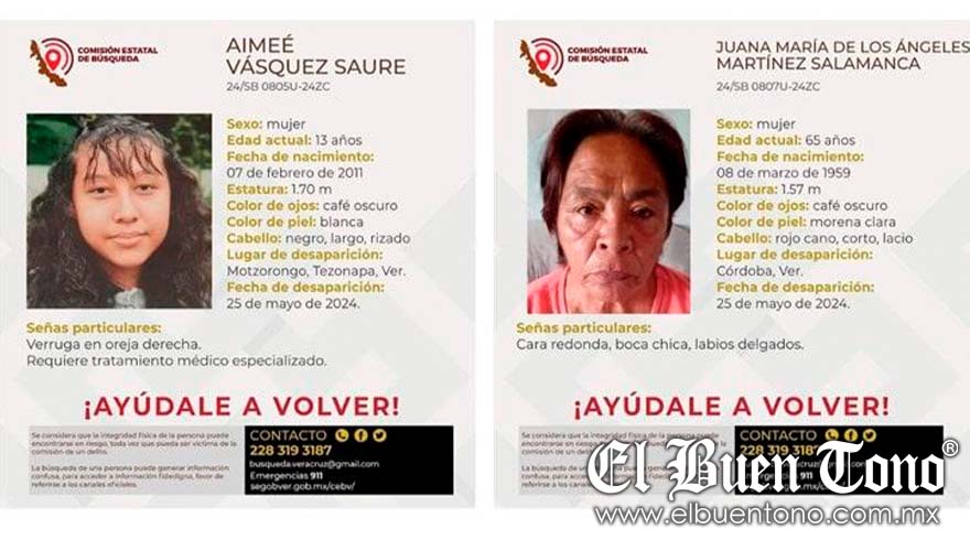 REGIÓN.- La Comisión Estatal de Búsqueda reportó la desaparición de dos mujeres, una menor de edad originaria de Motzorongo, municipio de Tezonapa, y la otra adulta mayor es de Córdoba.