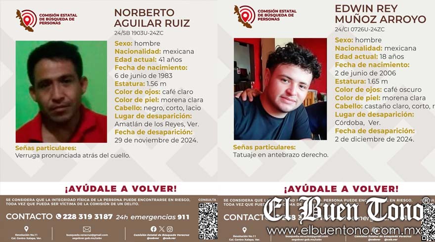 Región.- La Comisión Estatal de Búsqueda emitió dos boletines de emergencia por la desaparición de dos hombres: uno en Córdoba y otro en Amatlán.