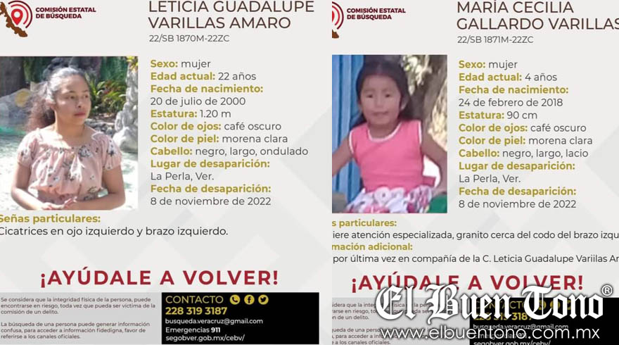 La Perla.- Leticia Guadalupe Varillas Amaro y su pequeña hija María Cecilia, de tan solo 4 años de edad, salieron de su domicilio el pasado 8 de noviembre y hasta el momento su familia no sabe nada de su paradero.