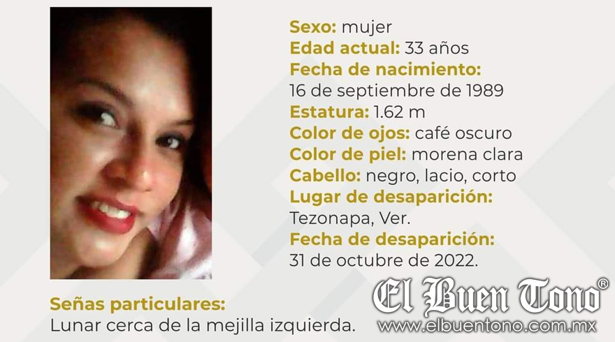 Tezonapa.- Una joven, identificada como Brisa Sadi Medina Chacón, de 33 años de edad, vecina de Tezonapa, esta reportada como desaparecida por la Comisión Estatal de Búsqueda, según boletín 22/SD 1832M-22ZC.