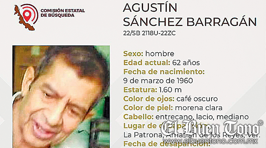 Amatlán.- Un hombre de 62 años de edad, identificado como Agustín Sánchez Barragán, vecino de la comunidad La Patrona, en Amatlán, se encuentra como desaparecido desde el pasado 17 de diciembre.