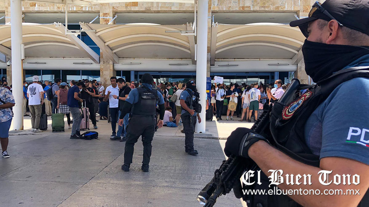 La Guardia Nacional informó que, en coordinación con las autoridades de la Secretaría de Marina, Agencia Federal de Aviación Civil y del Grupo Aeroportuario de Sureste (ASUR) se aplicaron los protocolos de seguridad establecidos para estos casos y de inmediato se procedió a realizar las investigaciones. Apuntó que las operaciones aéreas fueron suspendidas momentáneamente, reanudándose minutos después, toda vez que se confirmó que no existía ninguna situación de riesgo para los usuarios. La información disponible nos indica que el sonido pudo ocasionarse por la caída de tres anuncios derribados de manera accidental por un turista, pero se continúa investigando.