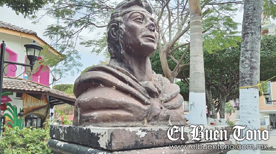 CUITLÁHUAC.- Una imagen descuidada del busto de Cuitláhuac, en el parque central, luce sin pintura, abandonada y carente de mantenimiento en lo que va de la administración, que preside Martín Rico Martínez.
