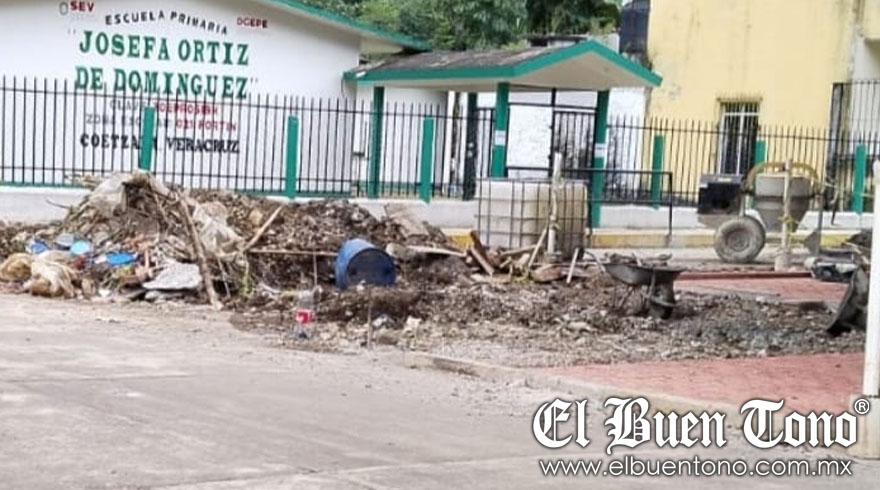 Coetzala.- Los desechos del material de la obra del parque, que realiza el ayuntamiento, fueron instalados al frente de la escuela primaria Josefa Ortiz de Domínguez, lo que ha provocado el malestar de padres de familia y estudiantes luego de que les impide el paso al ingresar o salir.