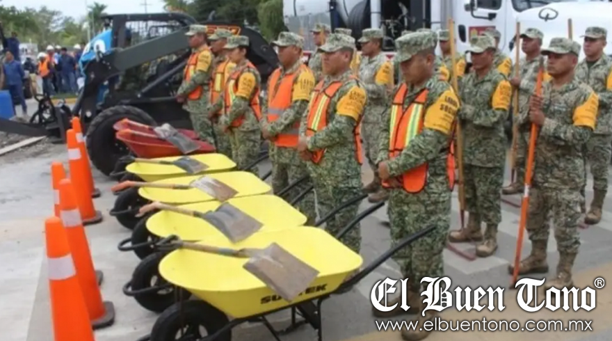 Un total de 75 militares, con maquinaria y herramientas especializadas, se encargan de atender problemas de pavimentación y mantenimiento de la red de agua, además de desazolvar drenajes y limpiar cunetas para mejorar el flujo de aguas residuales en la zona.