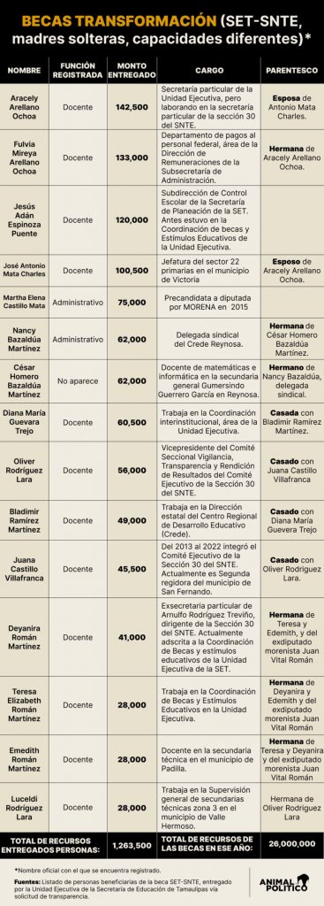 Tamaulipas.- Durante 2024, la Secretaría de Educación de Tamaulipas (SET) y la Sección 30 del SNTE desviaron 4.6 millones de pesos del programa de becas destinado a docentes con hijos con discapacidad, estudiantes y maestras jefas de familia. Gran parte de los recursos terminó en manos de integrantes de la cúpula sindical y sus familiares, muchos de ellos ‘comisionados’ que cobran salario del gobierno pero realizan labores sindicales.