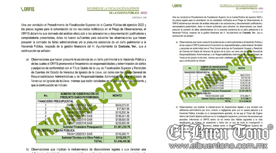 Coetzala. – El Órgano de Fiscalización Superior (ORFIS) del estado confirmó un daño patrimonial en la Cuenta Pública 2022 del Ayuntamiento de Coetzala, por un total de un millón cuatrocientos dieciséis mil cuatrocientos cuarenta y seis pesos con cincuenta centavos.