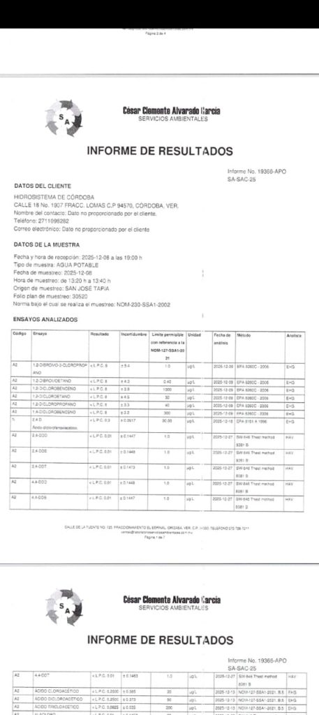 Córdoba, Ver.- Los informes de calidad del agua potable de Hidrosistema se aseguran dentro de la norma en la potabilización. Sin embargo, un análisis detallado y escéptico de las cifras revela grietas en la seguridad hídrica de la región, particularmente en la localidad de San José Tapia, donde la pureza del vital líquido queda en entredicho.