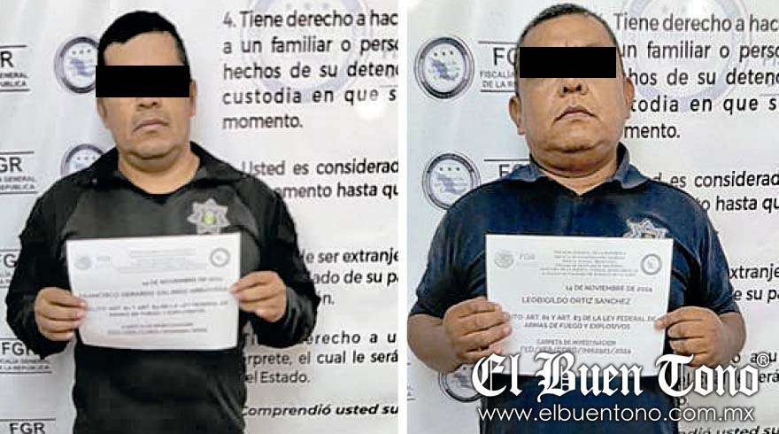 Los detenidos son Leovigildo “N” y Francisco Gerardo “N”, quienes se encuentran a disposición de la FGR por violación a la Ley Federal de Armas de Fuego y Explosivos.