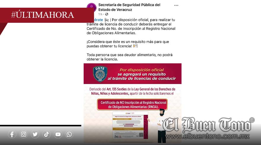 La Secretaría de Seguridad Pública de Veracruz anunció que a partir de ahora será obligatorio presentar el Certificado de No Inscripción al Registro Nacional de Obligaciones Alimentarias (RNOA) para tramitar o renovar la licencia de conducir en el estado.