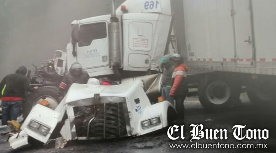 Maltrata.- El segundo percance ocurrió a las 15:00 horas en el kilómetro 234, en donde la neblina hizo que el chofer de un tráiler de la empresa IPSA, perdiera  la visión del camino y se estrelló contra el cerro que está a un costado.