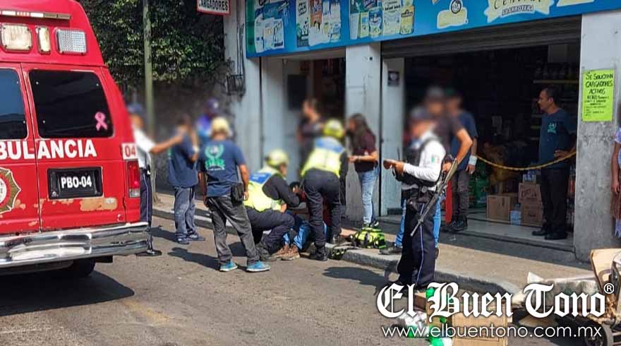 Orizaba.- Personal de la Unidad de Servicios Médicos de Protección Civil Municipal brindó asistencia a un “diablero” que fue arrollado por el conductor de un camión de pasajeros de la empresa Línea 40 mientras salía de una abarrotera cerca del Mercado Zapata.