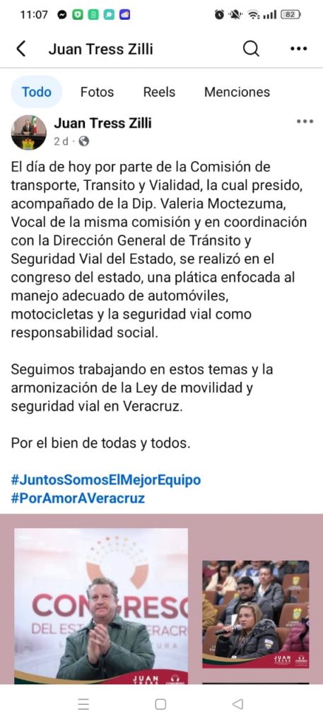 Tress Zilli, presidente de la Comisión de Transporte, Tránsito y Vialidad del Congreso de Veracruz, publicó un evento sobre “manejo adecuado” y “seguridad vial como responsabilidad social”. Sin embargo, esta autopromoción choca frontalmente con las denuncias que llueven en sus propias publicaciones y en foros públicos.