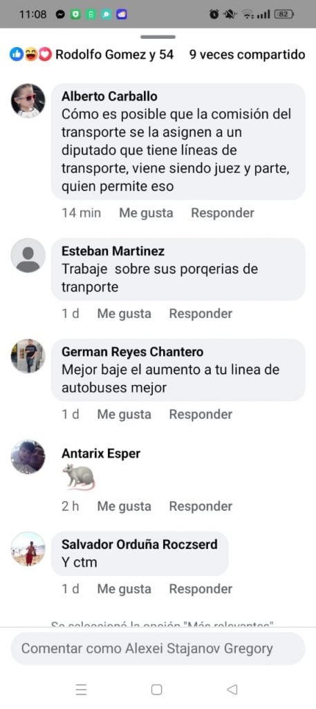 La crítica más severa apunta a un posible conflicito de interés. Usuarios como Alberto Carballo cuestionan abiertamente: “Cómo es posible que la comisión del transporte se la asignen a un diputado que tiene líneas de transporte, viene siendo juez y parte, ¿quién permite eso?”. Esta acusación socava la credibilidad de su gestión legislativa en materia de movilidad, al tener supuestos intereses económicos directos en el sector que debería regular.