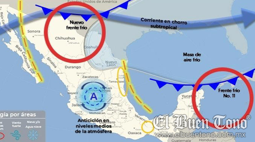 Mientras el frente frío 11 se extenderá sobre el Golfo de México e interactuará con un canal de baja presión en el oriente y sureste del país, el nuevo frente se acercará por la frontera norte. Esto provocará: