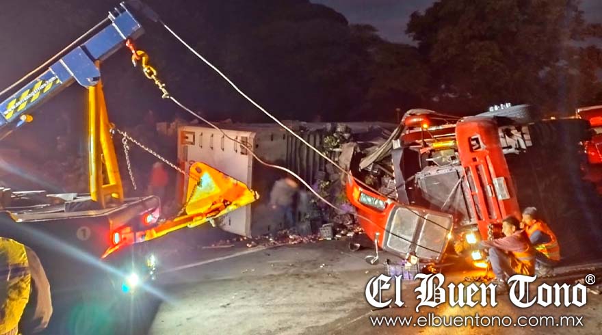 Tanto la caja de carga como el camión torton quedaron volcados sobre la autopista, lo que atrajo a personas inescrupulosas que llegaron al lugar para robar la carga de la unidad.