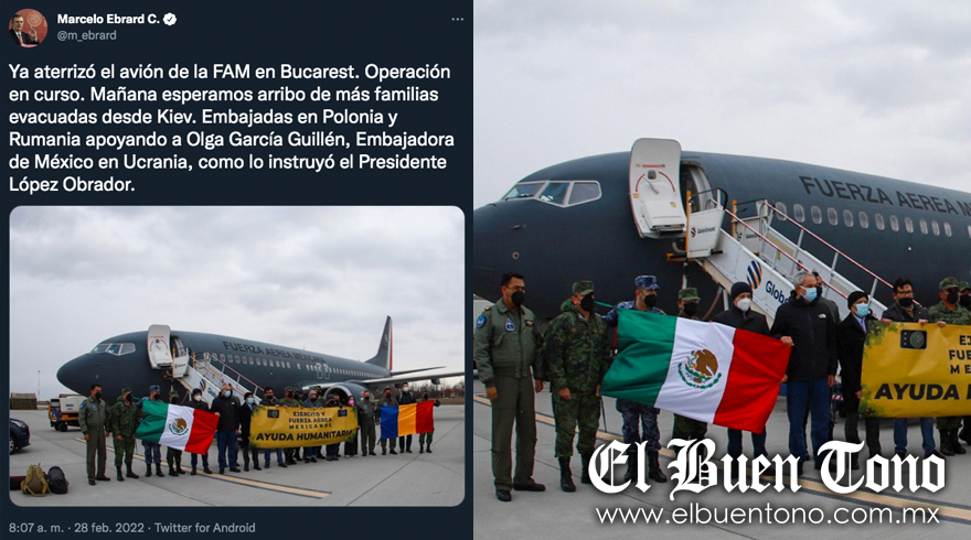 El avión de la Fuerza Área Mexicana aterrizó en Bucarest, capital de Rumania, para trasladar a las familias mexicanas que viven en Ucrania y que fueron evacuadas tras el estallido de la invasión rusa.