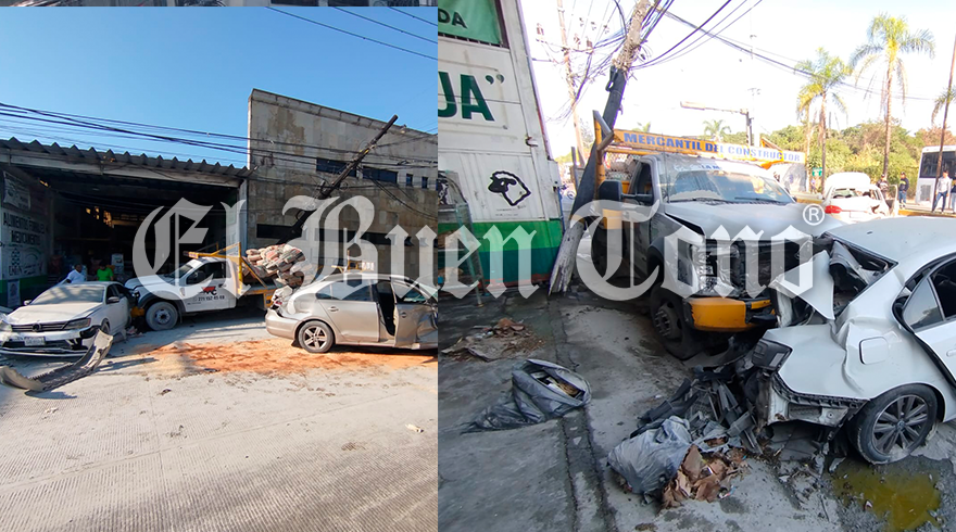 Tras el impacto, la camioneta de una ferretería, salió proyectada contra dos vehículos estacionados y derribó un poste de madera.