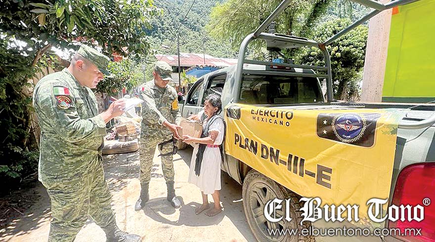 Por las graves afectaciones, el trabajo del personal militar sigue; en tanto unos limpian caminos rurales y apoyan a los damnificados, otros empezaron a distribuir mil 500 despensas en las zonas afectadas.