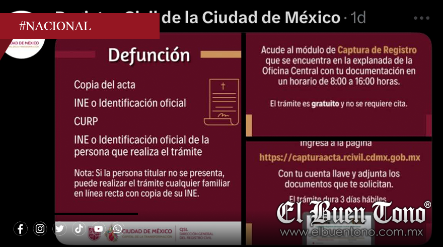 A través de X y Facebook, en las cuentas oficiales de la Tesorería CDMX, se compartió una imagen con los requisitos para obtener el documento. El detalle fue que, entre ellos, se pedía que “acuda el titular del acta de defunción”.