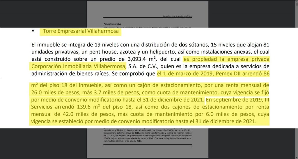 De acuerdo con la investigación, entre 2019 y 2021, dos filiales de Pemex rentaron espacios en la llamada Torre Empresarial Villahermosa -un lujoso inmueble de 19 pisos con helipuerto-, pese a que Adán Augusto no reportó estos ingresos en su declaración patrimonial. Los documentos citados por el periodista provienen de la Auditoría Superior de la Federación (ASF), en el informe “Auditoría Combinada de Cumplimiento y Desempeño: 2020-6-90T9N-21-0450-2021”.