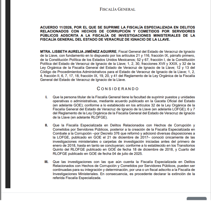 Veracruz.- La Fiscalía Especializada en Delitos Relacionados con Hechos de Corrupción y Cometidos por Servidores Públicos fue oficialmente suprimida en Veracruz, tras la publicación del acuerdo 11/2026 en la Gaceta del Estado. Esta área, que dependía de la Fiscalía General del Estado de Veracruz, dejó de operar a partir del martes, como parte de una reestructuración interna.