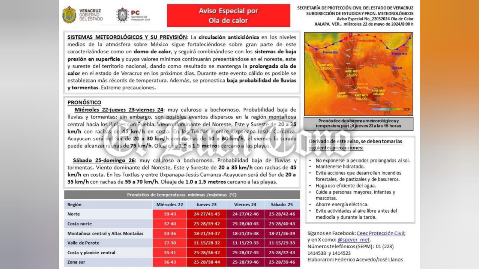 Se informa que la circulación anticiclónica en los niveles medios de la atmósfera sobre México sigue fortaleciéndose sobre gran parte de éste, caracterizándose como un domo de calor, y seguirá combinándose con los sistemas de baja presión en superficie y cuyos valores mínimos continuarán presentándose en el Noreste, Este y Sureste del territorio nacional dando como resultado se mantenga la prolongada ola de calor en el estado de Veracruz en los próximos días.