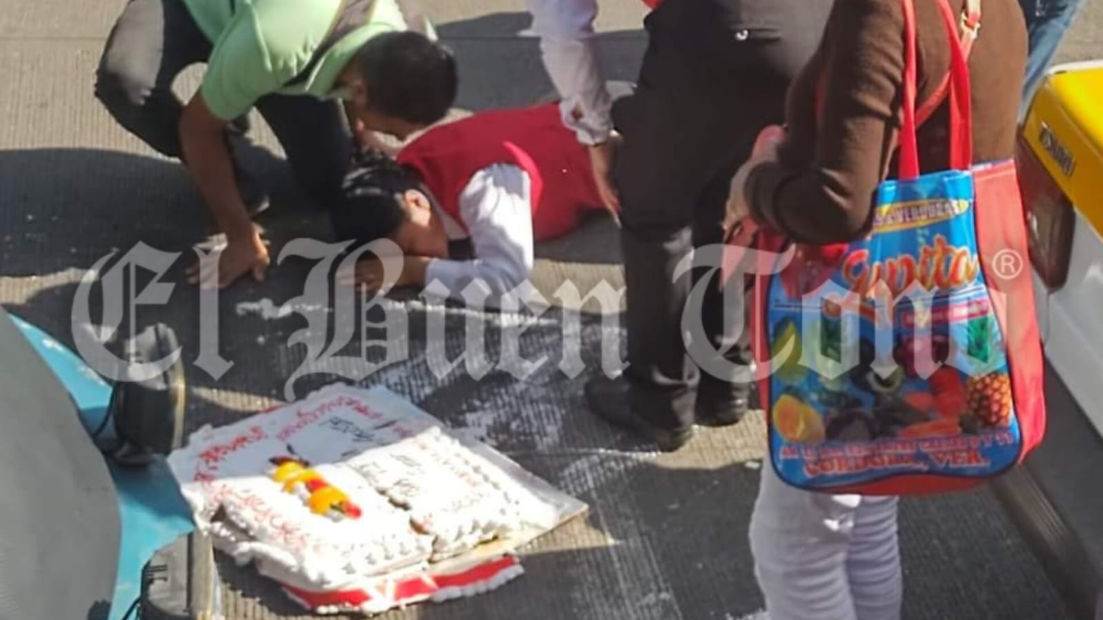 Al caer, llevaba un pastel, originando el cierre momentáneo de la circulación y la presencia de paramédicos de la Cruz Roja, que llegaron para valorar su estado de salud.
