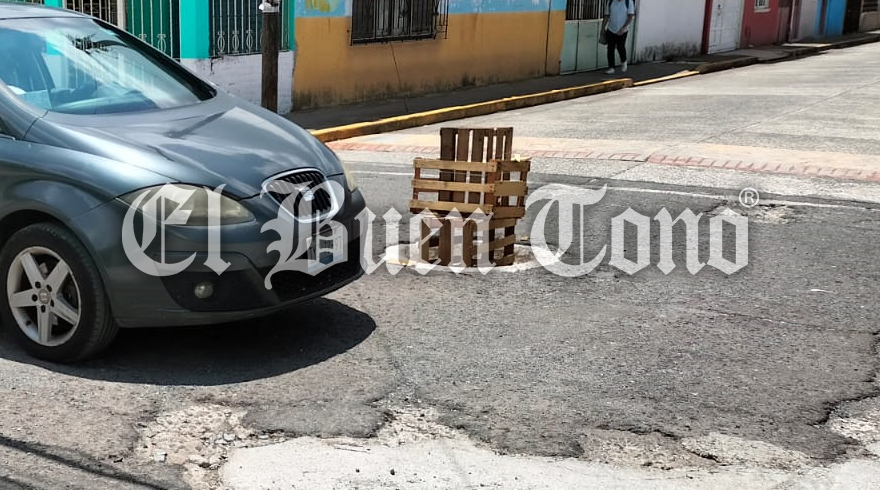 Debido a la exposición de las ollas, los vecinos de la calle Flores Magón y Mártires 15 de Mayo en la colonia Benito Juárez, han colocado cajas de madera para alertar a los conductores particularmente cuando llueve porque no se ven.