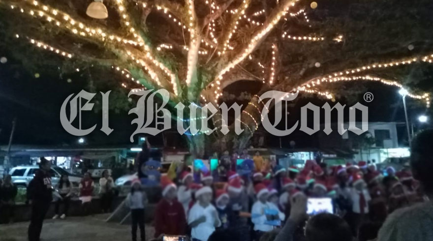 Los niños de la primaria Emiliano Zapata fueron los encargados de entonar diversos villancicos minutos después del encendido del emblemático árbol que lleva más de 100 años.