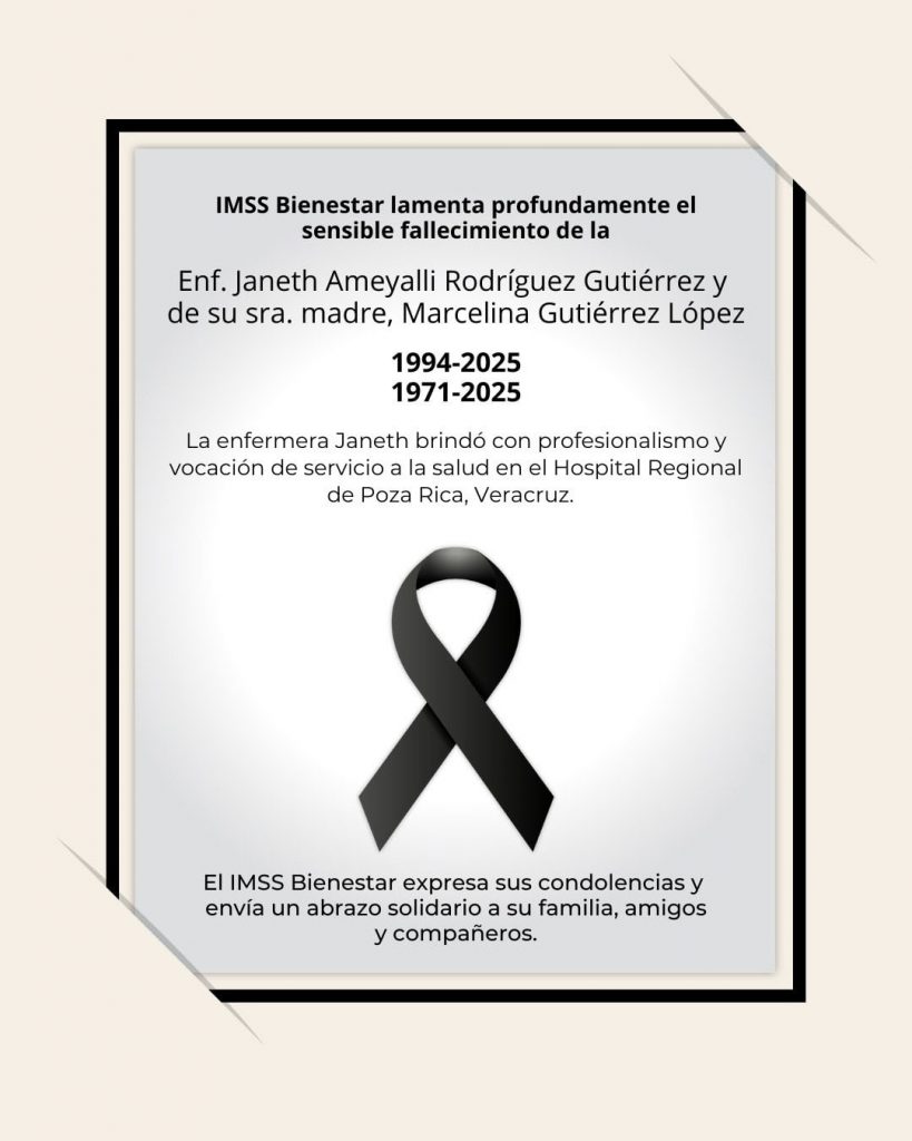 Poza Rica.- La enfermera Janeth Ameyalli Rodríguez, trabajadora del Hospital Regional IMSS-Bienestar de Poza Rica, y su madre, Marcelina Gutiérrez López, fueron reportadas entre las víctimas de las severas inundaciones que afectaron la zona norte de Veracruz durante los últimos días.