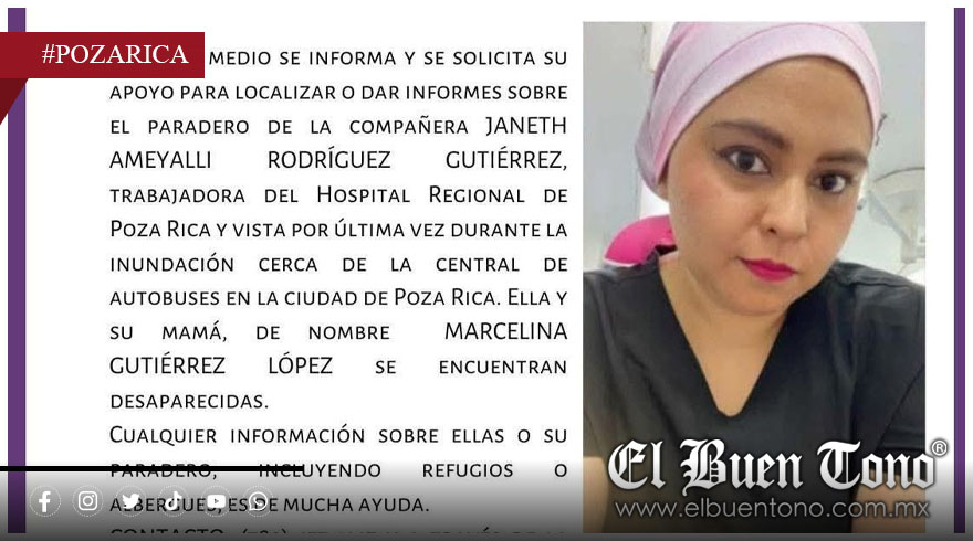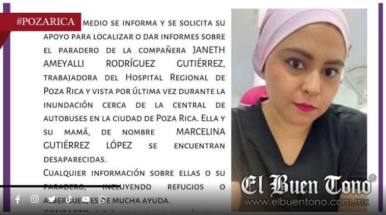 Poza Rica.- La enfermera Janeth Ameyalli Rodríguez, trabajadora del Hospital Regional IMSS-Bienestar de Poza Rica, y su madre, Marcelina Gutiérrez López, fueron reportadas entre las víctimas de las severas inundaciones que afectaron la zona norte de Veracruz durante los últimos días.