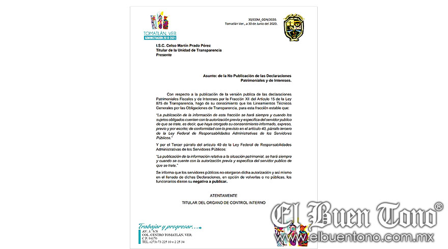 En dicho documento se puede leer como asunto “de la No Publicación de las Declaraciones Patrimoniales y de Intereses” y argumenta que dicha información sólo se hará siempre y cuando los sujetos obligados cuenten con la autorización previa y especifica del servidor público de que se trate.