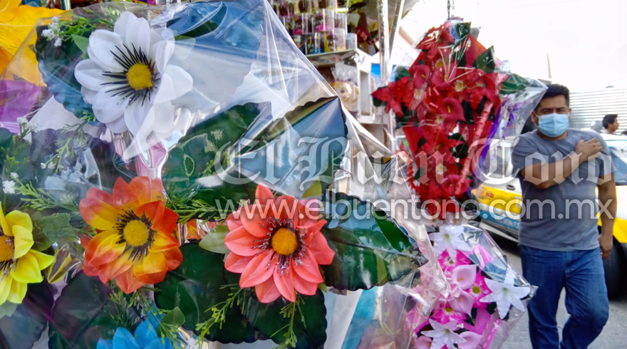 CÓRDOBA.- La venta de coronas de flores de papel ya ha dado inicio en los puestos ubicados en la periferia del Mercado Revolución. Los comerciantes esperan un repunte en las ventas este año debido a que la expectativa es que haya un mayor número de afluencia de visitantes derivado del cambio en la semaforización epidemiológica.