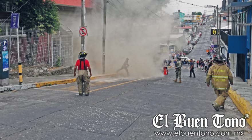 Con el apoyo de policías fueron evacuando al personal, como protocolo de seguridad, mientras arriba un trabajador logró apagar el fuego que se iniciaba, pero que el humo lo hacía ver peligroso.