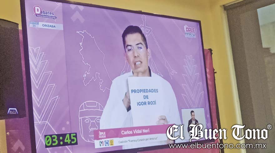 Orizaba.- En el marco del primer debate que realizó el Organismo Público Local Electoral (OPLE), el candidato a la Diputación local de la Coalición Fuerza y Corazón de Veracruz, Carlos Vidal Neri exhibió una carpeta de las propiedades que se adjudicó Igor Fidel Roji López cuando fue presidente