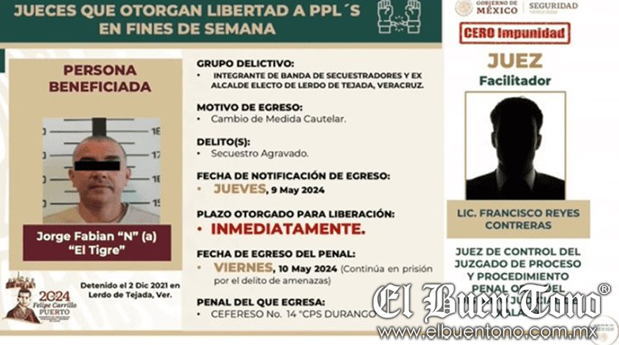 Rodríguez Bucio destacó que Francisco Reyes Contreras ordenó la liberación de Jorge Fabián “N”, alias “El Tigre”, exalcalde electo de Lerdo de Tejada. Jorge Fabián “N” fue detenido el 2 de diciembre de 2021 en Lerdo de Tejada por su presunta participación en una banda de secuestradores y está sujeto a proceso por secuestro agravado. A pesar de esto, recuperó su libertad el 9 de mayo de 2024. Según el subsecretario, el juez de control dictó la liberación inmediata del exalcalde electo, quien salió del CEFERESO No. 14 “CPS Durango” el 10 de mayo, aunque sigue en prisión por el delito de amenazas.