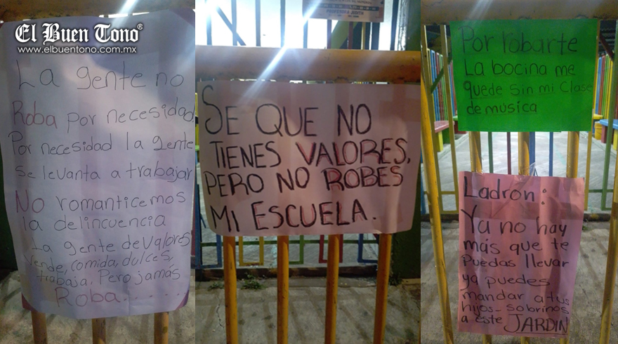 Con cartulinas colocadas al frente del jardín de niños, dan a conocer su malestar, los padres, y los menores le hicieron un llamado al ladrón, “se que no tienes valores pero no robes en mi escuela”, “Por robarte mi bocina me quede sin clase de música”.