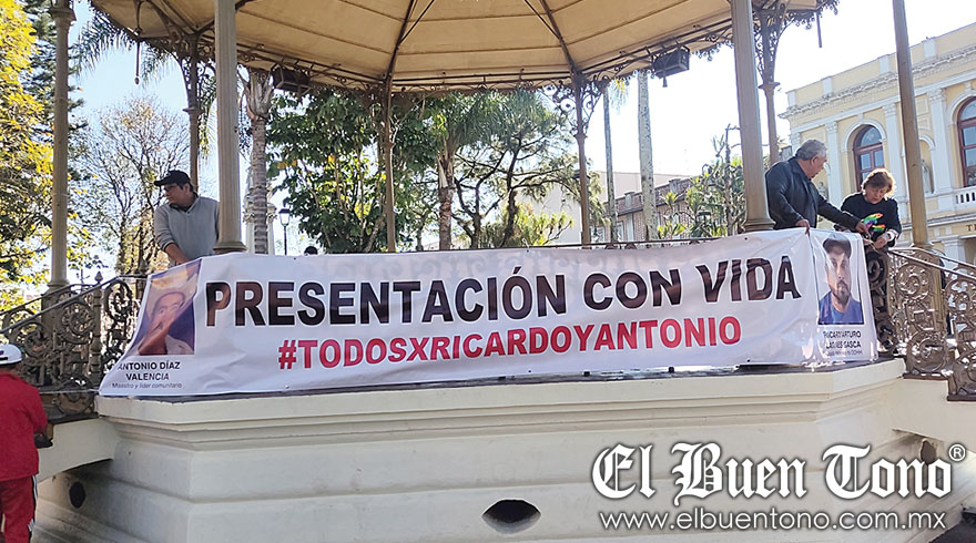 Orizaba.- Familiares y amigos de Ricardo y Antonio, defensores de la tierra, llevaron a cabo un plantón en el kiosco del parque Castillo para exigir la aparición con vida de ambos activistas.