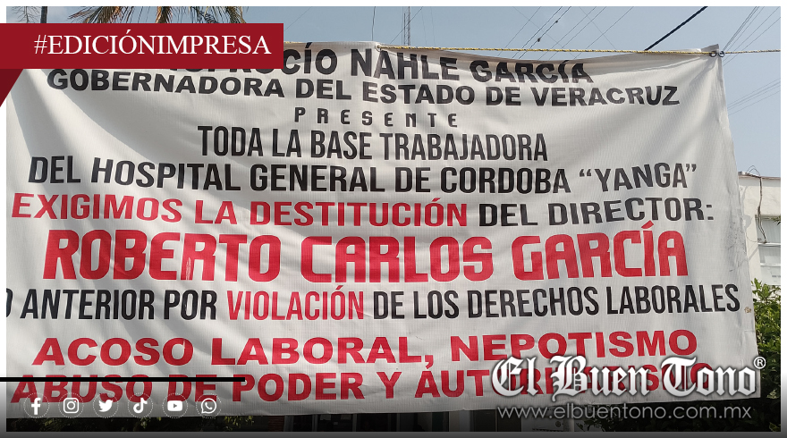 En la manta, firmada por “toda la base trabajadora del Hospital General de Córdoba ‘Yanga’”, los inconformes demandan la intervención inmediata de la jefa del Ejecutivo estatal al considerar insostenible la permanencia del directivo, a quien responsabilizan del deterioro interno del nosocomio y de un ambiente laboral marcado por amenazas e intimidaciones constantes al personal.
