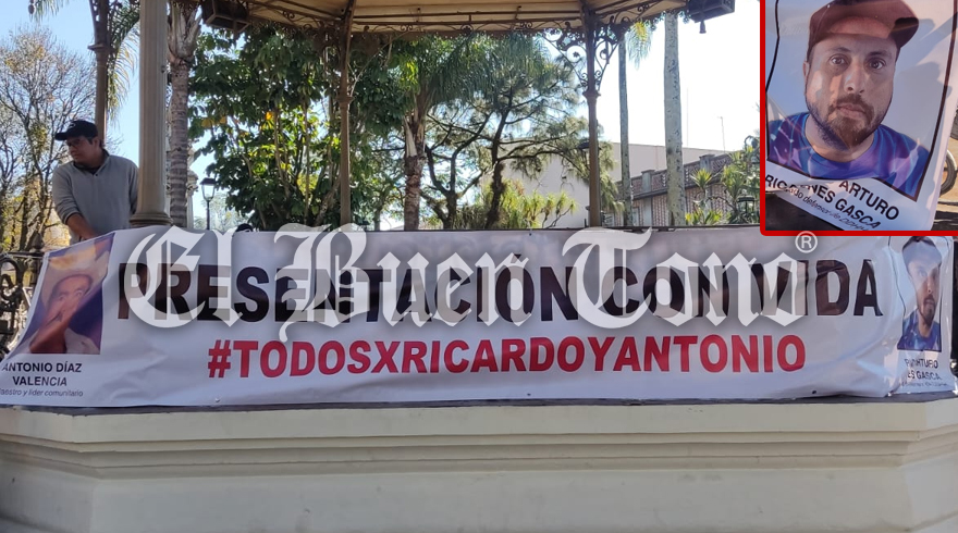 Orizaba.- Familiares y amigos de Ricardo y Antonio, defensores de la tierra, llevaron a cabo un plantón en el kiosco del parque Castillo para exigir su aparición con vida.