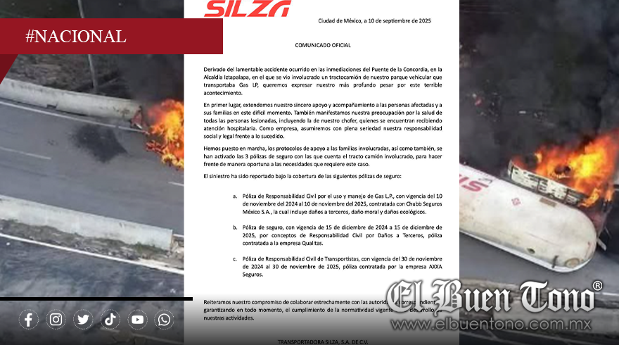 México.- Tras la trágica explosión ocurrida ayer debajo del puente de La Concordia, en la calzada Ignacio Zaragoza, alcaldía Iztapalapa —que dejó un saldo de 4 personas fallecidas, 90 heridas y más de 30 vehículos dañados—, la empresa Silza informó que el tractocamión involucrado sí contaba con cobertura de seguros vigente y que ya fueron activadas tres pólizas.