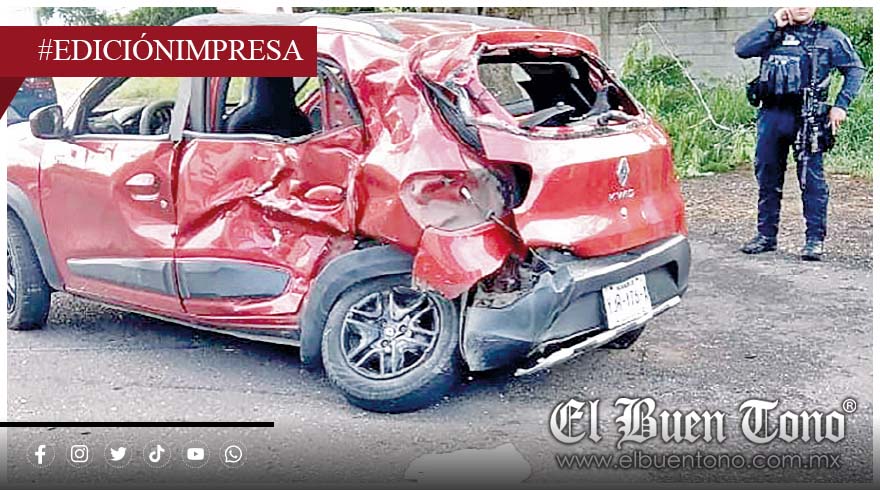 Esa mala maniobra sin precaución, provocó que fueran impactados por una camioneta blanca de tres toneladas y media, que destrozó la mitad del automóvil.